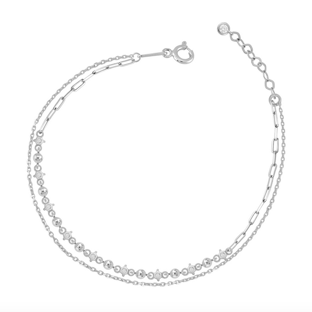 Тази двойна гривна от бяло злато с камъни циркони е перфектен пример за съчетание между финес и съвременна елегантност. Изработена от висококачествено 14К бяло злато, тя впечатлява с двоен дизайн – едната верижка е украсена с фини златни топчета, а другата с изящни циркони, които отразяват светлината с изключителен блясък.