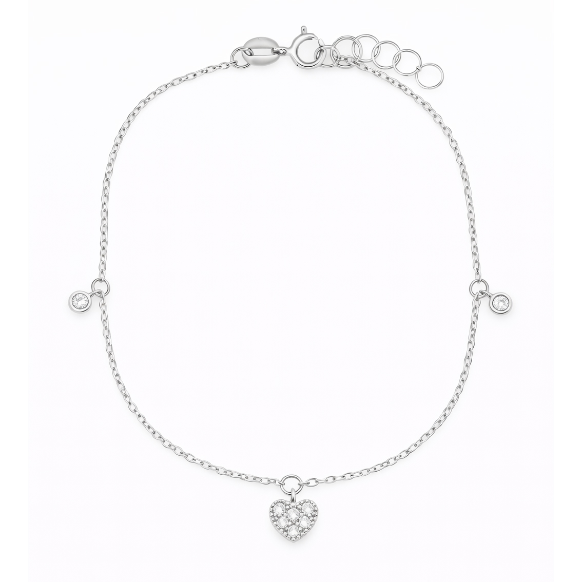 Тази изящна гривна от бяло злато 14К впечатлява с балансиран и елегантен дизайн. Централният елемент е фино сърце, инкрустирано с бляскави циркони, допълнено от деликатни висящи камъчета от двете страни, които придават лекота и движение при всяко движение на ръката.