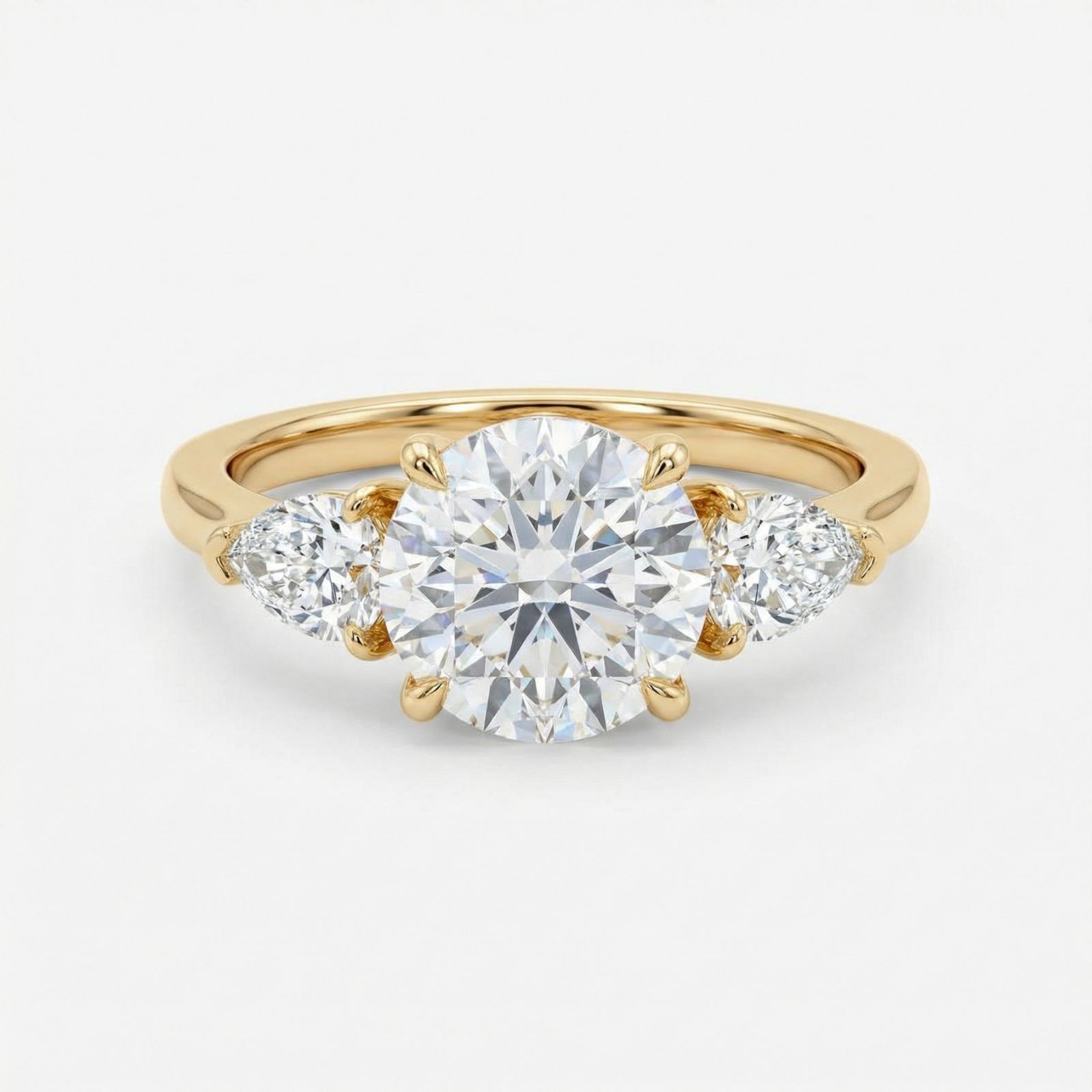 Двата странични лабораторни диаманта допълват хармонично композицията, придавайки баланс и допълнителна дълбочина на дизайна. Топлият оттенък на жълтото злато подчертава сиянието на диамантите и придава усещане за лукс, стабилност и вечна стойност.