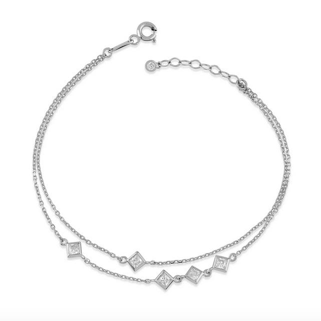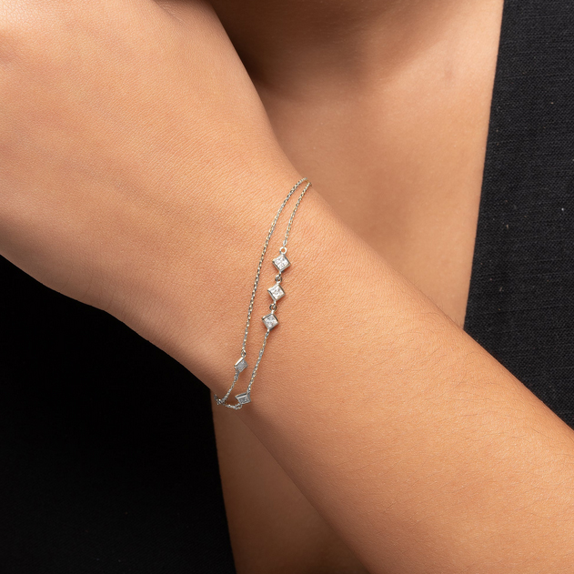 Изключително фина и елегантна, тази дамска двойна гривна от бяло злато съчетава две деликатни верижки с квадратни циркони, подредени в хармоничен ритъм. Блясъкът на камъните се откроява върху студения метален отблясък на бялото злато, създавайки усещане за чистота, стил и лукс.