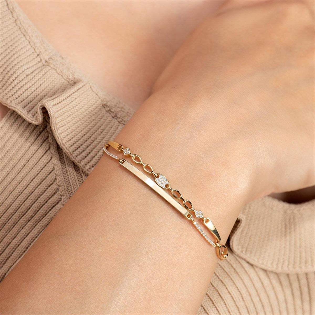 Елегантната гривна от жълто злато с камъни циркони е символ на изтънченост и женственост. Изработена от висококачествено 14К злато, тя съчетава фина верижка с деликатни декоративни елементи и блестящи циркони, които улавят светлината с изключителен ефект.