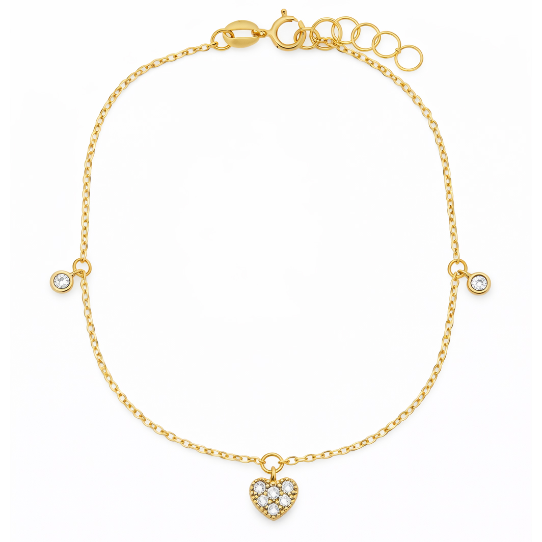 Тази изящна гривна от жълто злато 14К съчетава класическа стойност и модерна естетика. Централното сърце, инкрустирано с блестящи циркони, е символ на нежност и внимание към детайла. Деликатните висящи елементи от двете страни добавят движение и фин блясък при всяко движение на ръката.