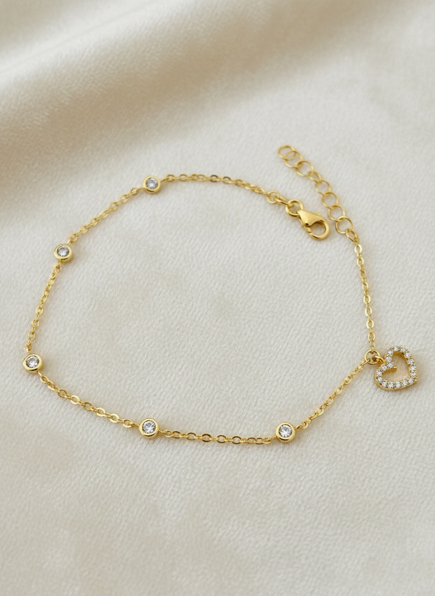 Тази изящна златна гривна със сърце съчетава минималистичен дизайн и елегантен блясък. Изработена от висококачествено 14-каратово злато, гривната впечатлява с деликатно сърце, инкрустирано с фини циркони, които придават нежен луксозен акцент.