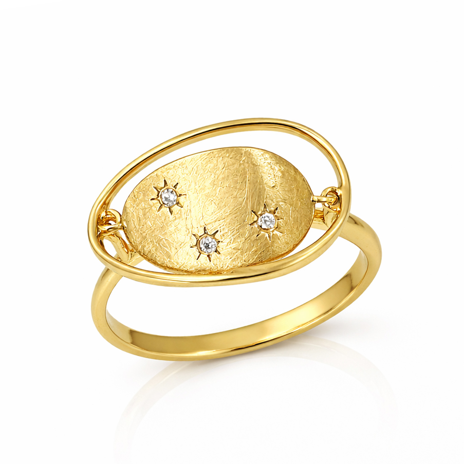 Трите циркона са деликатно инкрустирани в звездовидна форма, създавайки усещане за нежна светлина и изискан детайл. Обрамчващият овален контур добавя модерна геометрия и подчертава централния мотив, превръщайки пръстена в стилен акцент.