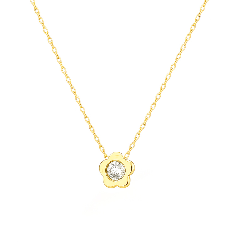 Колие жълто злато с малка висулка цвете с блестящ циркон е съчетание от изящество и лукс, което подчертава твоя уникален стил. Изработен от висококачествено 14 к злато, този елегантен медальон пленява с фините си детайли и искрящ камък, привличайки всички погледи.