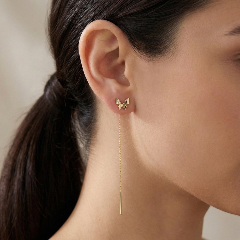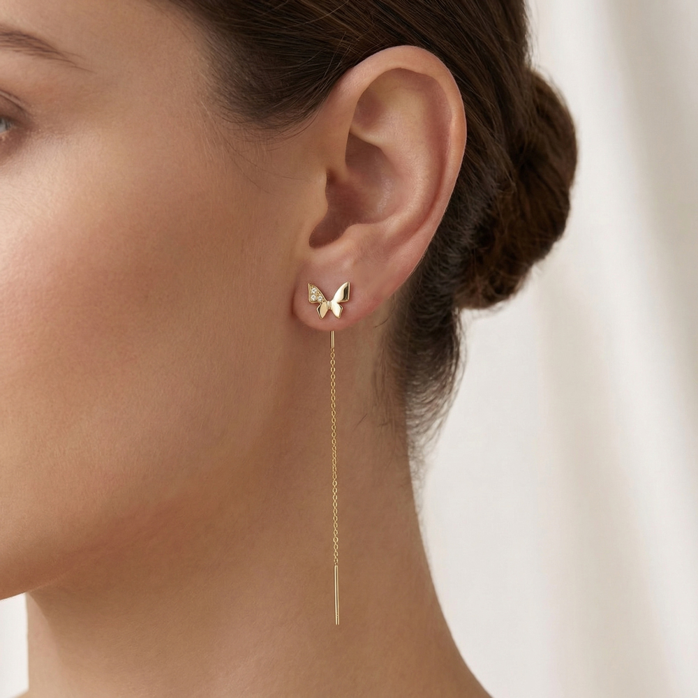 Деликатната пеперуда символизира свобода и лекота, а фината верижка с издължен елемент придава движение и ефирност. При всяко движение обеците улавят светлината и създават впечатляващ, но фин ефект.