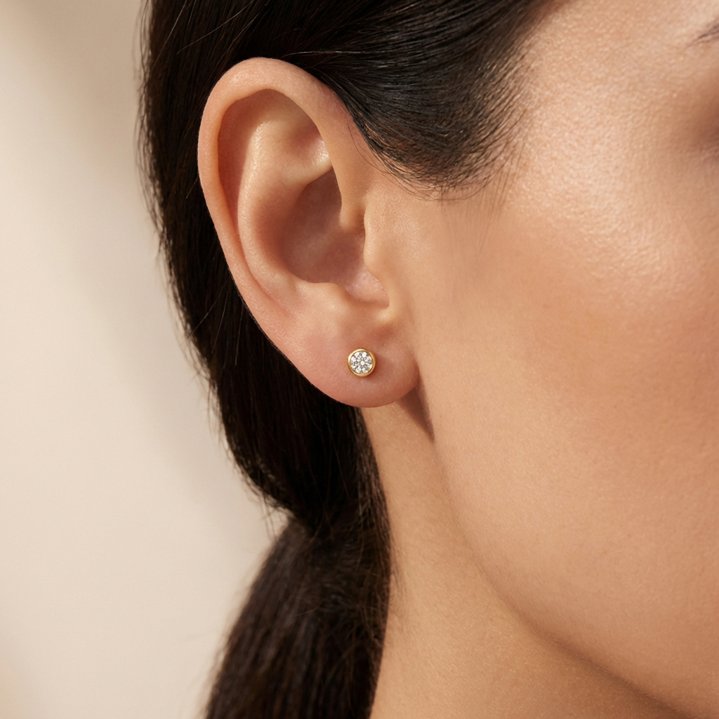 Тези обеци солитер от 14 карата жълто злато с циркон впечатляват с изчистен и модерен дизайн тип „бейзел“ (обков). Централният камък е обграден от гладка златна рамка, която осигурява сигурна фиксация и подчертава блясъка му по елегантен начин.