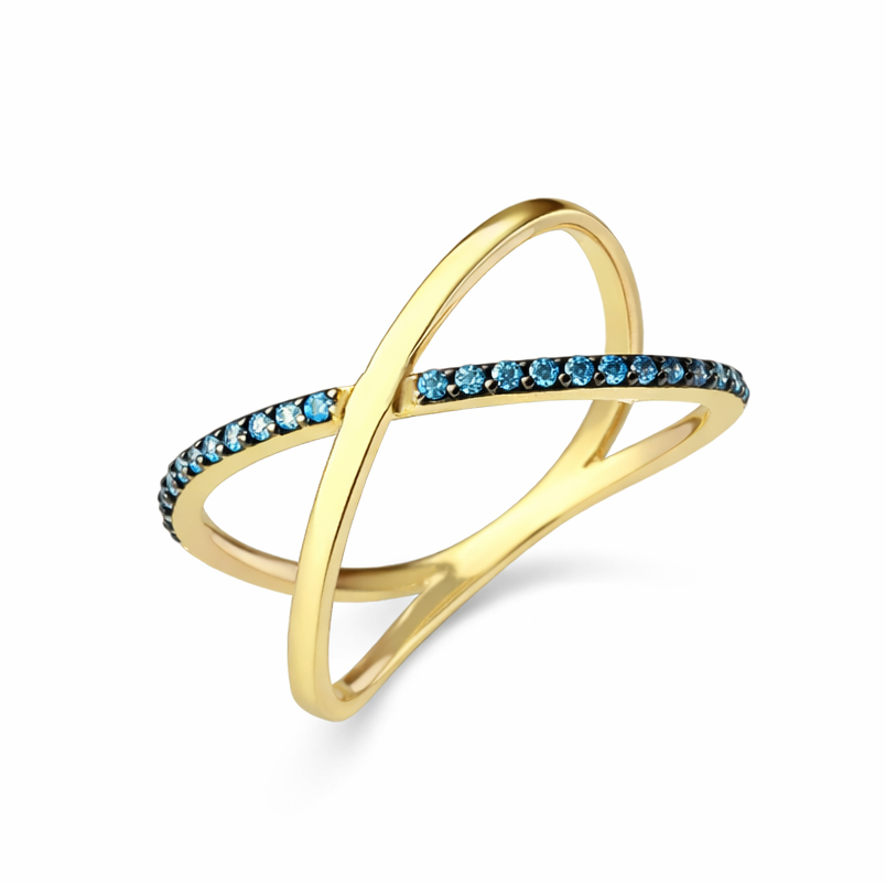 Дамски пръстен от жълто злато с сини камъни – модерен дизайн с динамична линия и впечатляващ контраст. Елегантно преплетените златни форми създават усещане за движение и лекота, а фината инкрустация от наситено сини камъни добавя дълбочина и характер.
