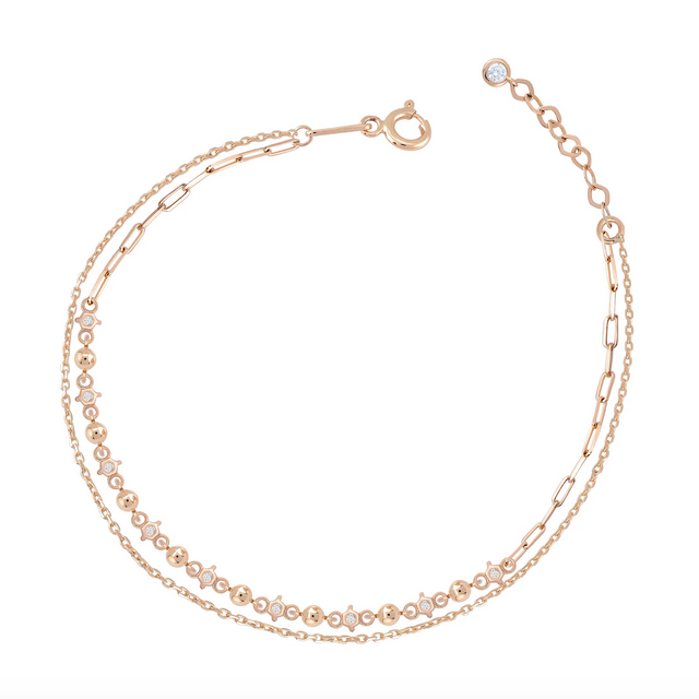 Открийте нежната красота на тази двойна гривна от розово злато, съчетаваща две различни верижки – фина и модерна, украсени с искрящи циркони. Всеки детайл е изработен с прецизност, за да подчертае изяществото и женствеността на своята притежателка.