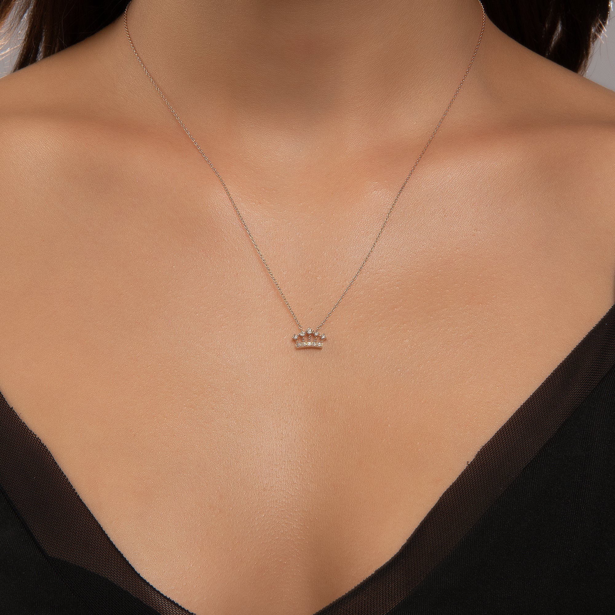 Розовото злато придава нежност и модерно излъчване, а елегантната корона в центъра на това колие подчертава женственост и самоувереност. Комбинацията между фината верижка и прецизната корона създава изтънпен силует, който стои деликатно върху деколтето и привлича вниманието с дискретен блясък.
