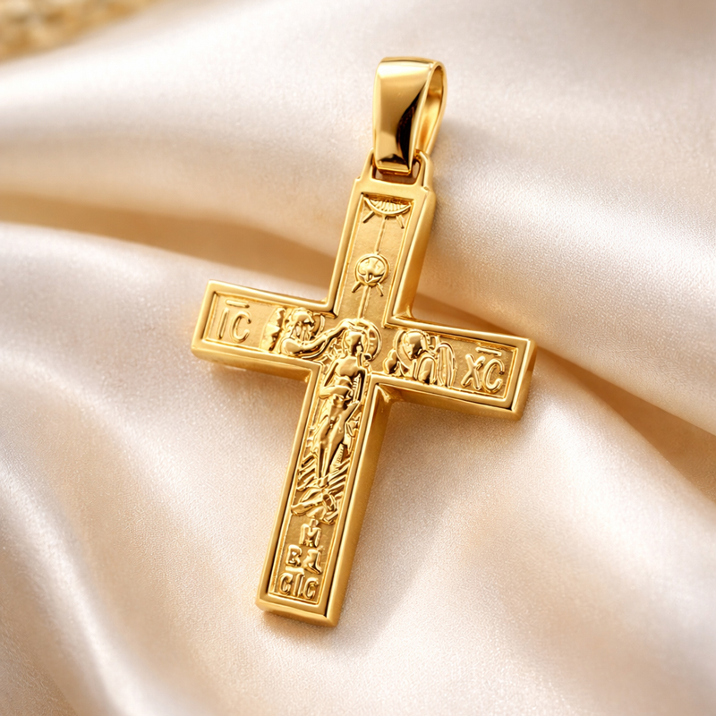 От едната страна на кръста е изобразен разпнатият Исус Христос с традиционните православни символи IC XC, които са характерни за православната иконография. Фината релефна изработка придава изключителна детайлност и подчертава духовното значение на бижуто.