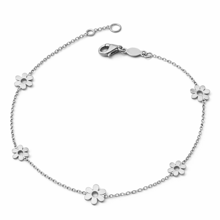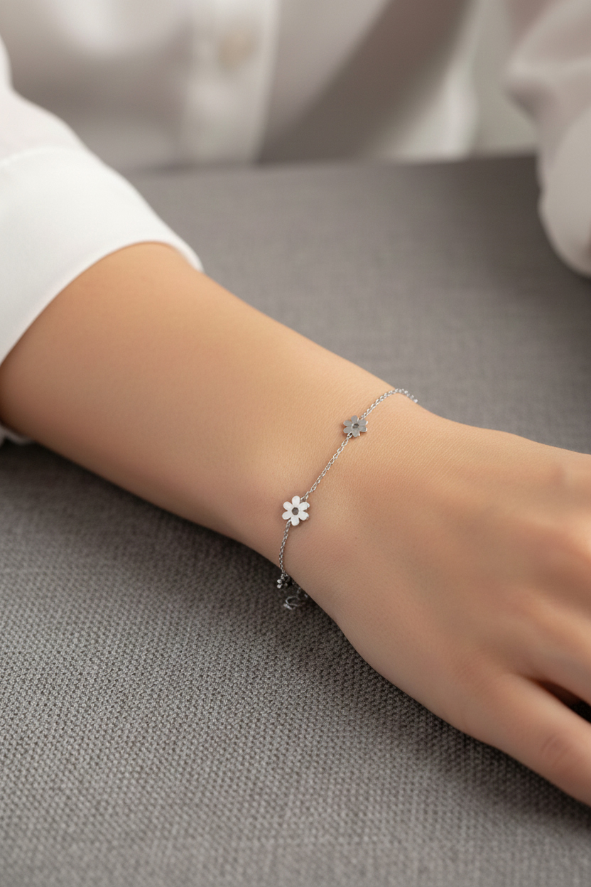 Стилна и изискана гривна от бяло злато 14 карата, създадена за жени, които предпочитат модерна и дискретна елегантност. Декоративните елементи във формата на цветя придават фин акцент и усещане за лекота, без да нарушават изчистената визия на бижуто. Липсата на камъни подчертава естествения блясък на бялото злато и прави гривната универсален аксесоар.