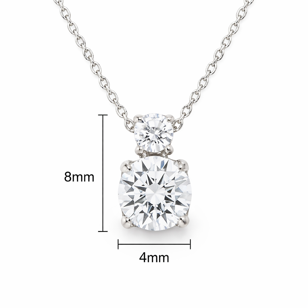 Изработено от висококачествено бяло злато 14 карата, колието комбинира класически блясък и съвременна линия. Двата камъка са подредени вертикално, което придава издължен и изтънчен силует. Горният камък добавя деликатен акцент, а долният – основен блясък и визуален фокус.
